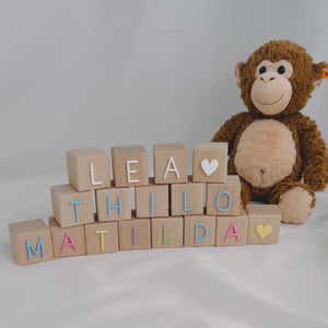 Du suchst nach einem besonderen Babygeschenk zur Geburt, Taufe oder Babyparty? Du möchtest etwas schenken, das nicht nur ein tolles Geschenk ist, sondern auch als Deko im Babyzimmer einen besonderen Platz findet? Dann sind unsere personalisierten Namenswürfel aus Holz genau das richtige für dich! Diese Buchstabenwürfel mit dem Namen des Babys sind ein echter Hingucker im Kinderzimmer und begleiten das Kind über viele Jahre. Egal ob zum ersten Geburtstag oder als Willkommensgeschenk - diese Holzwürfel mit den hübschen Acryl-Buchstaben sind eine liebevolle und individuelle Geschenkidee, die garantiert für Begeisterung sorgt.