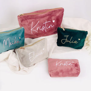 Diese Kosmetiktasche aus Samt wird mit Namen und einem Herz personalisiert. Das macht unsere Kosmetiktasche zum ganz persönlichen Geschenk zu Weihnachten, zum Geburtstag oder Muttertag. Egal ob deine beste Freundin, deine Mama, deine Trauzeugin oder eine liebe Kollegin. Es ist ein tolles Geschenk für jede Frau. Mit dieser praktischen Schminktasche hat man alles dabei, was man braucht. Egal ob im Urlaub, im Büro, beim Sport oder beim Wochenendausflug.