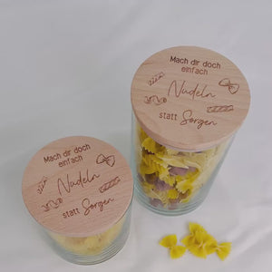 Jeder Deckel wird mit den Nudelsorten und dem Spruch "Mach dir doch einfach Nudeln statt Sorgen" graviert. Es handelt sich um eine hochwertige Lasergravur.