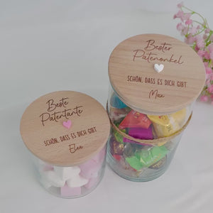 Dieses personalisierte Vorratsglas ist ein tolles Geschenk für alle Paten. Mit dem liebevoll gravierten Deckel ist es ein ganz persönliches Geschenk für die Patentante oder den Patenonkel. Mit der Beschriftung "Bester Patenonkel" oder "Beste Patentante", sowie dem Text "schön, dass es dich gibt" und der Personalisierung mit dem Namen erhält die Patin oder der Pate eine tolles persönliches Dankeschön. Egal ob direkt zur Taufe oder als Weihnachtsgeschenk, oder Geburtstagsgeschenk für die Paten ist dieses Glas eine ganz persönliche Erinnerung und eine tolle Art Danke zu sagen, für die besondere Verbindung der Paten zu deinem kleinen Schatz.